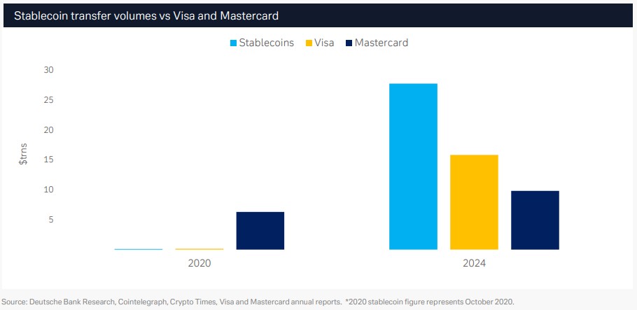 According to news from the Wind Trading Desk, Deutsche Bank's latest research report shows that stablecoins are entering mainstream payment systems at an astonishing speed, with transaction volumes exceeding $28 trillion, surpassing Visa and Mastercard. Traditional payment giants are also beginning to embrace this trend—Visa recently announced a partnership with stablecoin company Bridge to enable cross-border payments and connections with Latin America, and invested in the startup BVNK to further develop its stablecoin payment capabilities.