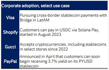 According to Deutsche Bank, some well-known companies have also begun adopting stablecoins, such as Shopify customers being able to pay with USDC via Solana Pay; Gucci accepting cryptocurrencies, including stablecoins, in select stores since 2022; and PayPal announcing in April that customers can earn 3.7% on its PYUSD stablecoin