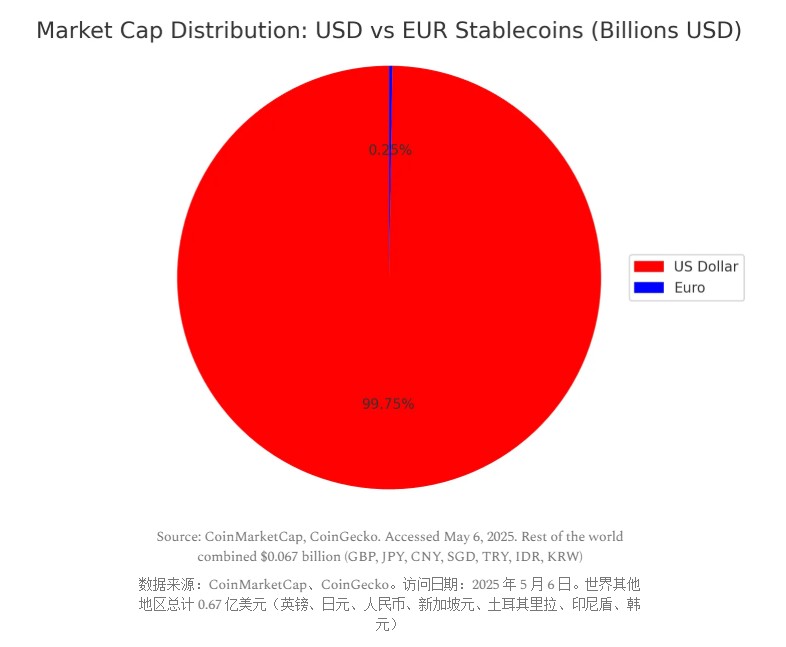 First is the overwhelming market advantage. Euro-denominated stablecoins account for a negligible share of the global market— the total market capitalization of the top ten euro stablecoins is about €600 million, representing only 0.24% of the entire stablecoin market. This limited liquidity results in higher transaction costs for euro stablecoins in practical applications