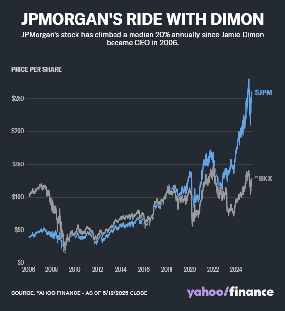 可以肯定的是,無論誰接任,都會面臨艱難的挑戰。在戴蒙的領導下,摩根大通近年在客户存款、市場估值和年度利潤方面遠超行業對手。在股價方面,自 2006 年戴蒙擔任首席執行官以來,摩根大通股票的年均漲幅為 20%,超過了同一時期內標普 500 指數 13.4% 的年均漲幅。與此同時,摩根大通的股價表現也優於美國銀行業基準的 KBW 銀行指數——該指數自 2006 年以來的年均漲幅為 7.2%。