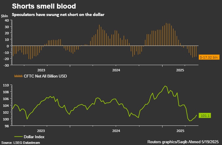 NEW YORK, May 19 (Reuters) - Trade-related uncertainties, ballooning fiscal debt and weakened confidence about enduring U.S. exceptionalism have weighed on U.S. assets, with the dollar one casualty. Investors see the currency losing more of its luster as the greenback comes back to earth from lofty valuations.