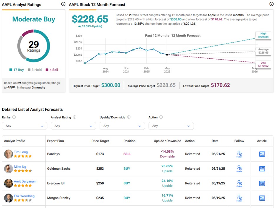 Analysts remain divided on Apple's long-term stock trajectory. On TipRanks, AAPL stock has a Moderate Buy consensus rating based on 17 Buys, eight Holds, and four Sell ratings. Also, the average Apple price target of $228.65 implies 13.6% upside potential from current levels. Year-to-date, AAPL stock has lost 19.4%.