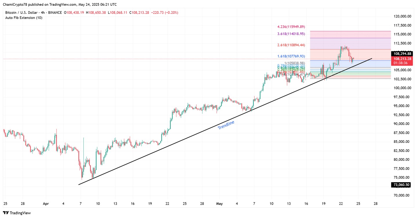 BTC continued to trade above a clean ascending trendline on the 4-hour chart at press time, currently bouncing near the 1.618 Fibonacci level at $107.7K.