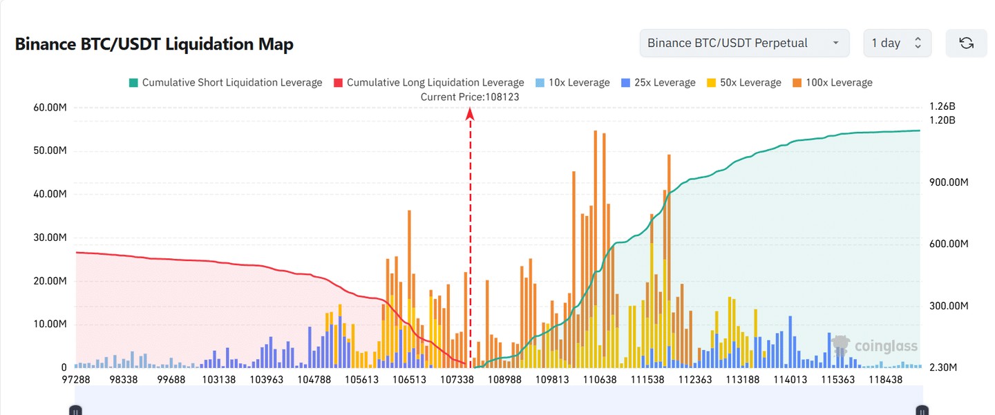 The BTC Binance liquidation map shows a concentration of short liquidations above $108K, signaling that bears are being squeezed as price climbs.