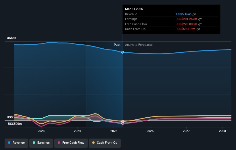- Revenue: US$5.16b (down 9.4% from FY 2024).