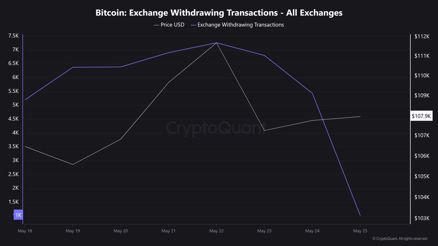 The declining number of Exchange Withdrawing Transactions—a key indicator tracking how often BTC is moved to private wallets, suggested selling pressure may be dwindling.