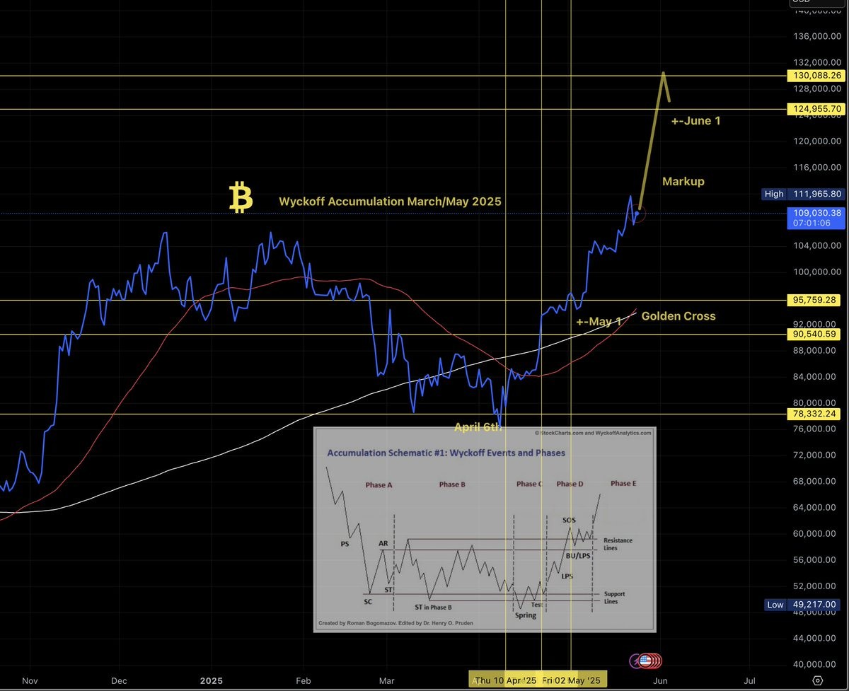 - Bitcoin enters Wyckoff Phase E with a ‘golden cross,’ setting sights on $125K short-term.
