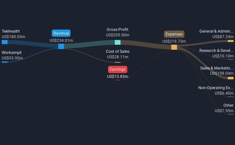 Operations: The company generates revenue primarily from its telehealth services, accounting for $180.05 million, and Worksimpli segment contributing $53.95 million.