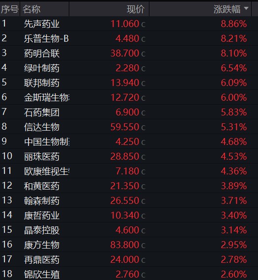 創新藥表現更猛,先聲藥業漲超 8%,樂普生物、藥明合聯、綠葉製藥、聯邦制藥等上漲超 6%,創新藥板塊漲幅超 3%。