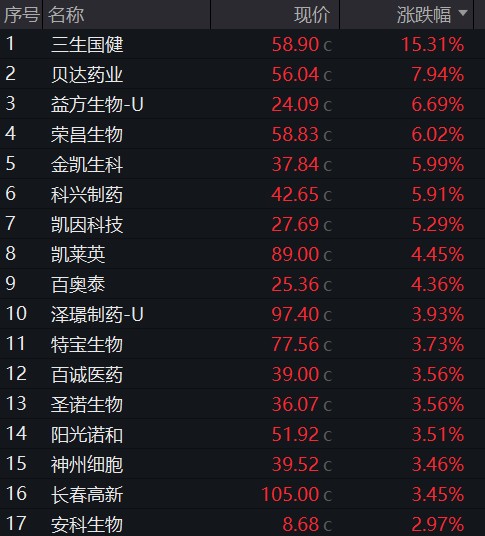 A 股創新板塊拉昇,三生國健漲超 15%,刷新歷史高點,貝達藥業、益方生物、榮昌生物、金凱生科等漲幅靠前。