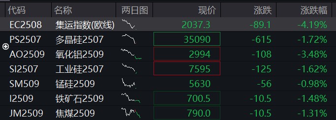 Domestic commodity futures opened lower in the morning, with most declining. Alumina and polysilicon fell over 3%, pulp dropped more than 2%, PX and short fibers fell over 1%, while hot-rolled coils and cotton yarn saw slight declines; Shanghai zinc and NR rose over 1%, and caustic soda and international copper saw slight increases.