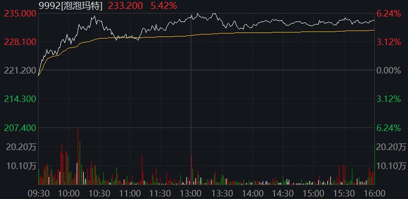 泡泡瑪特收漲 5.42%,股價報 233.2 港元/股,盤中創歷史新高。