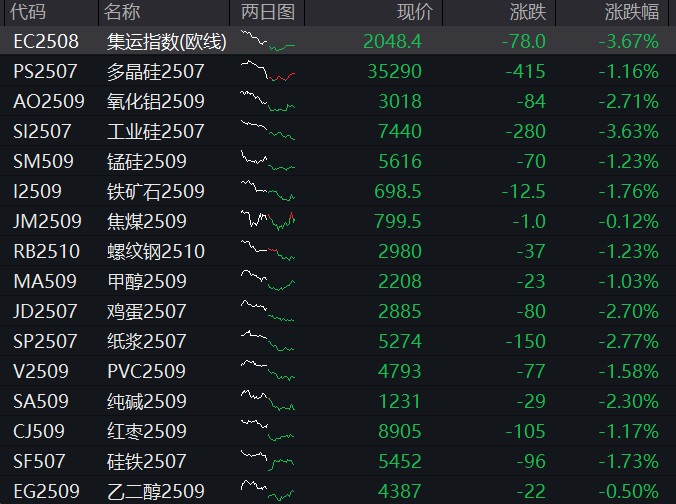 商品:國內商品期貨收盤,跌多漲少。集運歐線、工業硅跌超 3%,雞蛋、紙漿等跌逾 2%,熱卷、螺紋鋼等跌超 1%,棉花、瓶片等小幅下跌;NR 漲超 2%,菜粕漲逾 1%,豆粕、花生等小幅上漲。