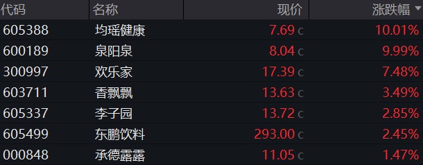 今天 A 股的乳業、軟飲料等板塊走強,其中,均瑤健康漲停,西部牧業、騎士乳業等紛紛跟漲,泉陽泉、歡樂家、東鵬飲料等走高。