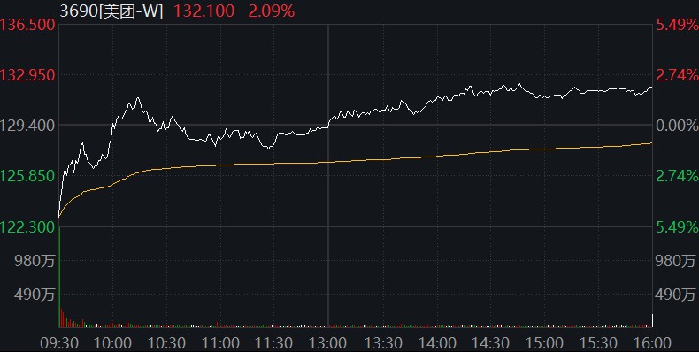 美團低開高走,午後維持漲勢,收漲超 2%,今天開盤一度跌 5.5%。