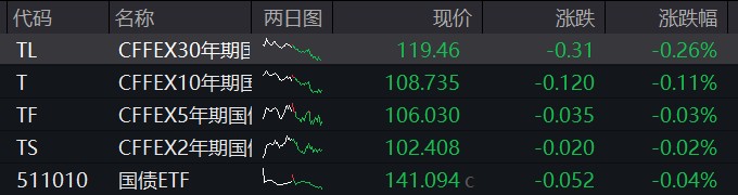 債市:國債期貨全線收跌,30 年期主力合約跌 0.26%,10 年期主力合約跌 0.11%,5 年期主力合約跌 0.03%,2 年期主力合約跌 0.02%。