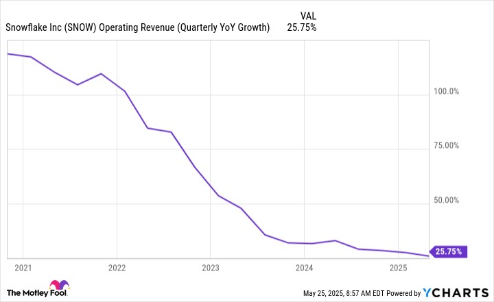 Snowflake's product revenue grew 26% year over year in its fiscal 2026 first quarter to $996.8 million. That was its slowest rate of increase on that metric since the company went public in 2020. In fact, Snowflake's revenue growth is consistently trending lower with each passing quarter.