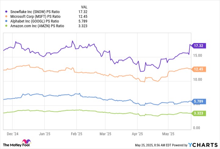 But Snowflake stock has soared by 47% to around $200 since Berkshire sold. Does that mean Buffett and his team made a mistake? I don't think so, because I would argue it's now overvalued. The stock is trading at a price-to-sales (P/S) ratio of 17.3, which is significantly more pricey than cloud and AI leaders like Amazon, Microsoft, and Alphabet: