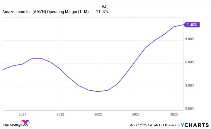 Amazon's projected revenue growth in 2025 and 2026 is 9% and 10%, respectively. This might immediately throw red flags for investors, as it's slower than the broader market's growth. However, Amazon isn't a revenue growth story; it's a margin expansion story. Over the past few years, Amazon's higher-margin segments have grown much faster than its lower-margin ones, allowing its margins to expand dramatically.