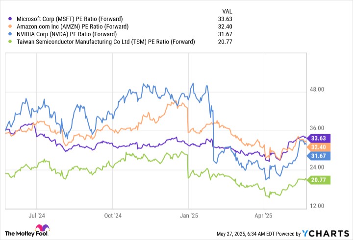 The second thing that stands out is how cheap Taiwan Semiconductor is compared to the other three. Taiwan Semi's stock can be purchased for under 21 times forward earnings, which is significant because the S&P 500 trades for 22.1 times forward earnings. This is a lower-than-market multiple, yet Taiwan Semi is expected to deliver monster growth over the next five years. Management believes its AI-related revenue can increase at a 45% compound annual growth rate (CAGR), and its overall revenue CAGR will approach 20%.