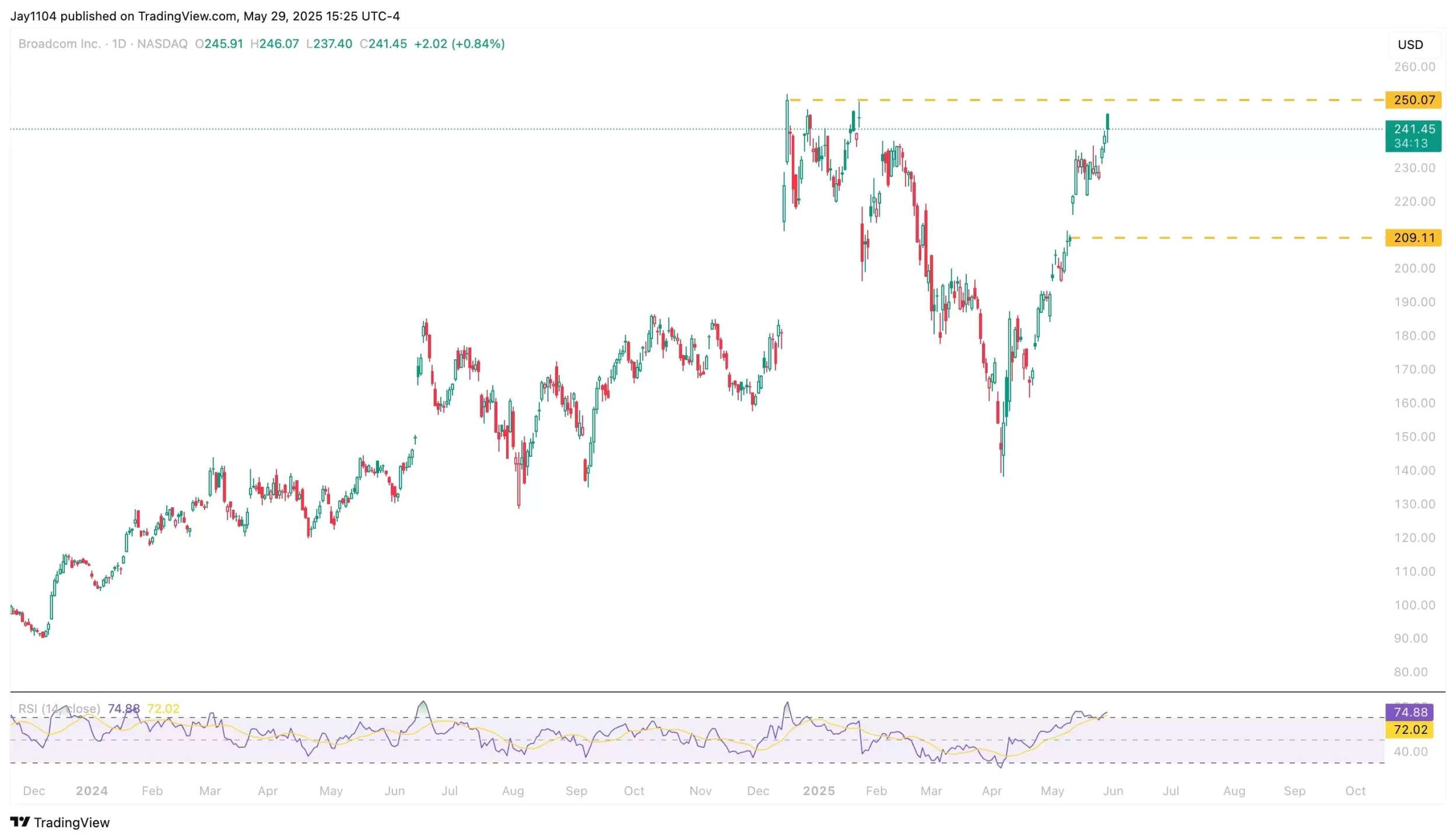 分析師預計博通第二季度每股收益將增長 42.5%,達到 1.56 美元,收入將增長 20%,達到 150 億美元,毛利率為 78.8%。展望第三季度,納斯達克上市的半導體公司的收入預計將增長 20.7%,達到 158 億美元,儘管毛利率預計會略微下降至 78%。該股票在週四上漲 1%,收於 242 美元以下,基於當前期權市場定價,財報後的交易可能會波動約 7.5%。