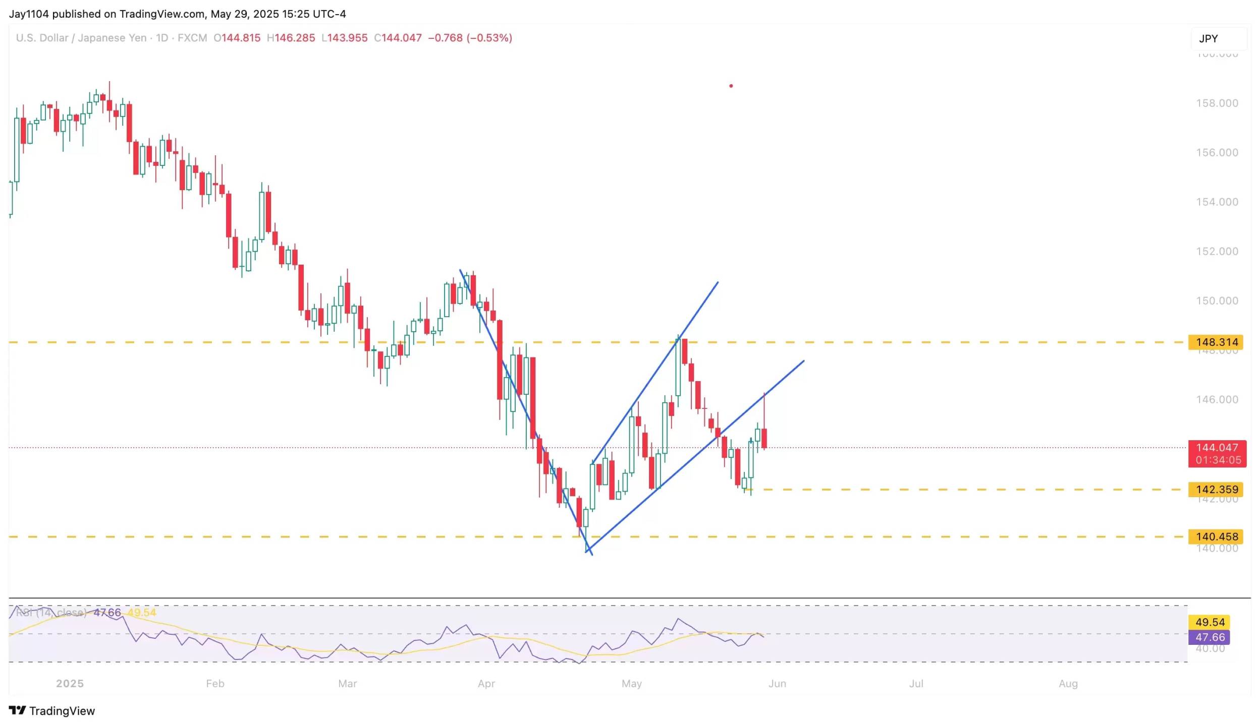 在日本利率上升和美國不確定性加劇的背景下,USD/JPY 匯率反映了套利交易的平倉和潛在的避險交易轉變。該貨幣對已經突破,跌出了一個喇叭形態(下圖中兩條發散的藍線),並最近測試了接近 142 日元的突破水平。如果 USD/JPY 能跌破 142.35 日元,可能會在短期內重新測試 140 日元水平。任何表明美國經濟進一步疲軟的數據只會增加這種順風。