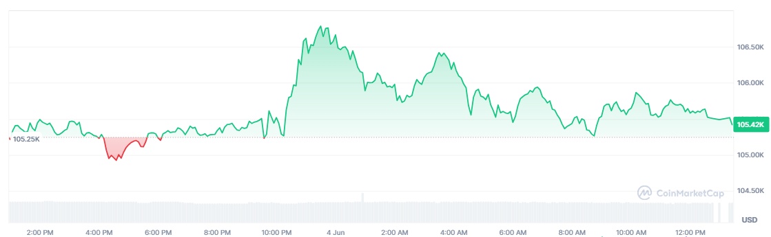 On Wednesday, June 4, Bitcoin (BTC) continued its recovery, climbing back above $105,000. Market data shows BTC hit a daily high of $106,794, marking its highest level in a week.