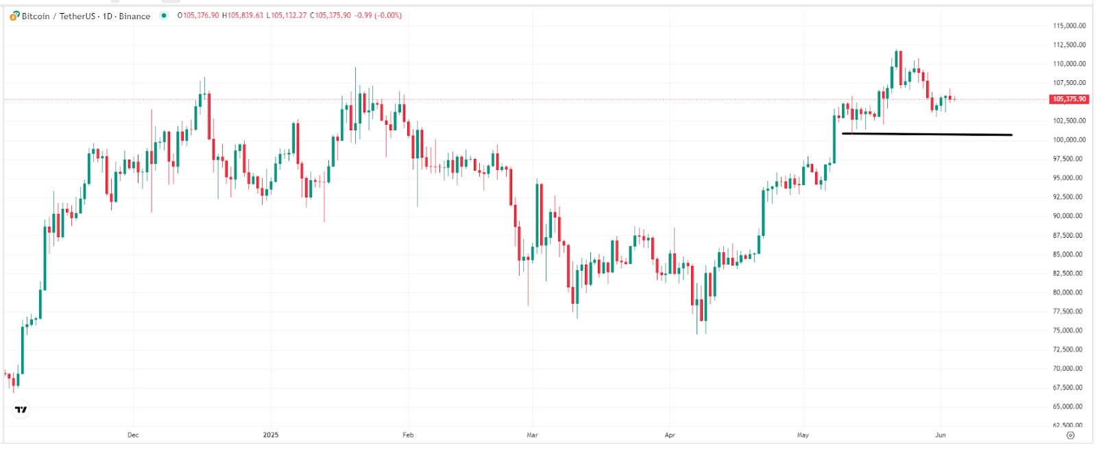 - Subsequently, BTC declined toward $100,000, hitting a low of $103,068 on May 31, forming a new support zone.