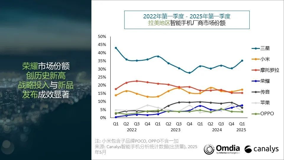 In the first quarter of 2025, the smartphone market shipment in the Latin America region was 33.7 million units, a year-on-year decrease of 4%, ending six consecutive quarters of growth. Samsung ranked first with 11.9 million units, while Xiaomi ranked second with 5.9 million units. Motorola's shipments were 5.2 million units, dropping to third place. Honor rose to fourth place with 2.6 million units, while Transsion saw a significant decline of 38% in shipments due to intensified competition, ranking fifth. Economic uncertainty and inventory adjustments affected market performance