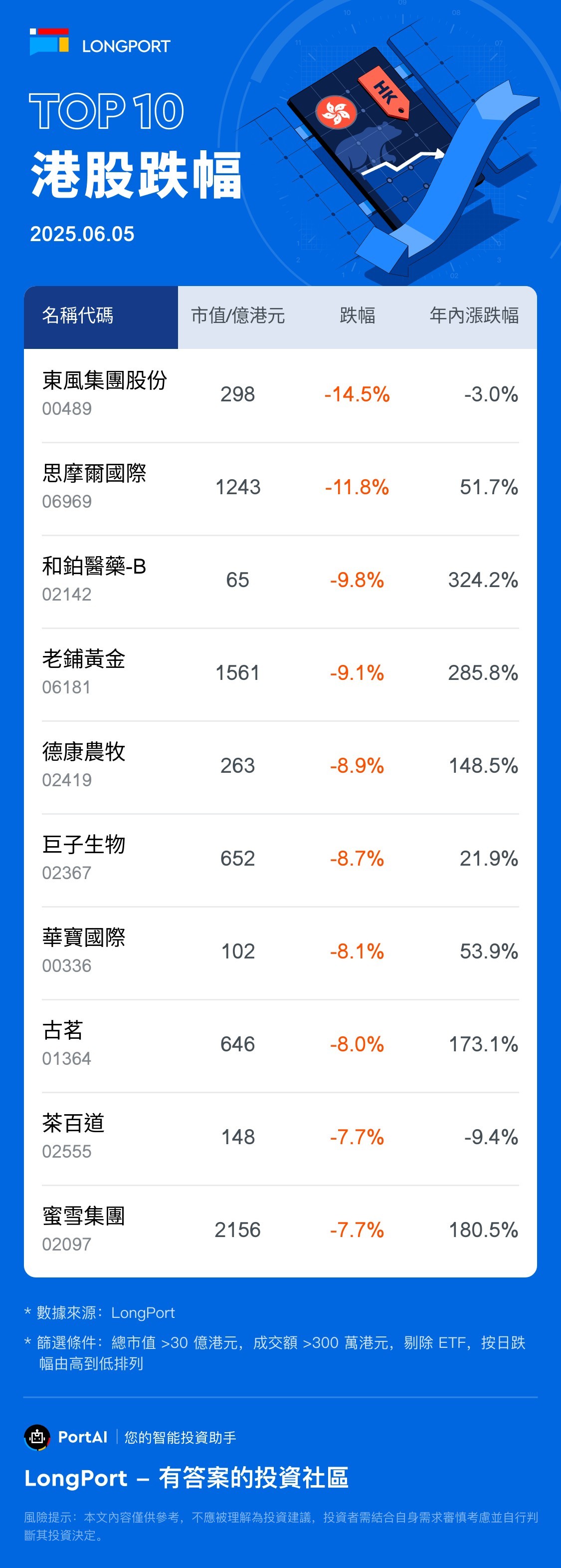 東風集團股份 (00489) 跌 14.45%,成交额 9.5 亿港元,年内累计跌 3%。 思摩爾國際 (06969) 跌 11.84%,成交额 21.0 亿港元,年内累计涨 51.7%。 和鉑醫藥-B(02142) 跌 9.83%,成交额 1.7 亿港元,年内累计涨 324.2%。