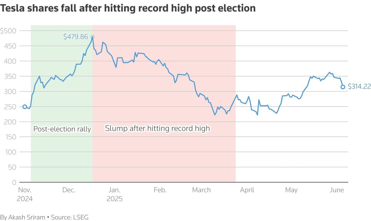 The stock has been on a roller-coaster ever since Musk endorsed Trump in mid-July 2024 in his re-election bid, gaining 169% from that point through mid-December. That was followed by a 54% slide through early April as a "Tesla Takedown" protest intensified.