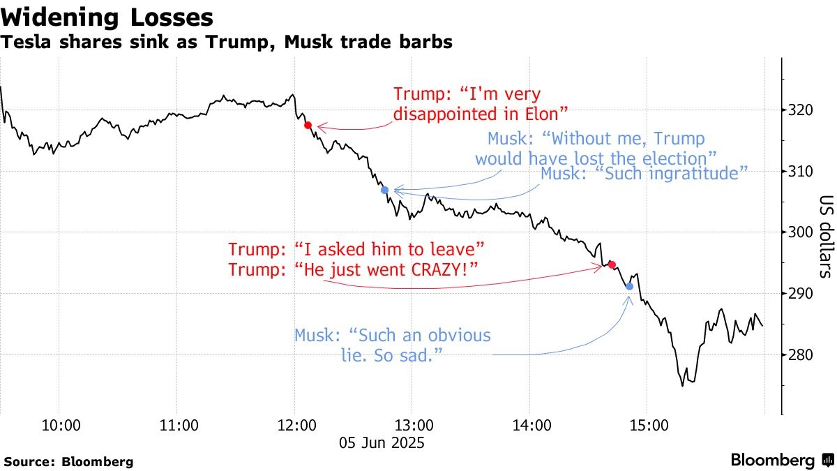 唐纳德·特朗普与埃隆·马斯克在一场激烈的交锋中公开对峙,几乎达到了全面的政治和个人破裂。特斯拉的股票在一天内暴跌 14%,市值蒸发了 1530 亿美元。