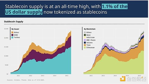 On the infrastructure side, Ethereum and Tron continue to dominate. But if we focus on recent months, we will find that stablecoin activity on public chains such as Solana, Arbitrum, and Base has also grown significantly.