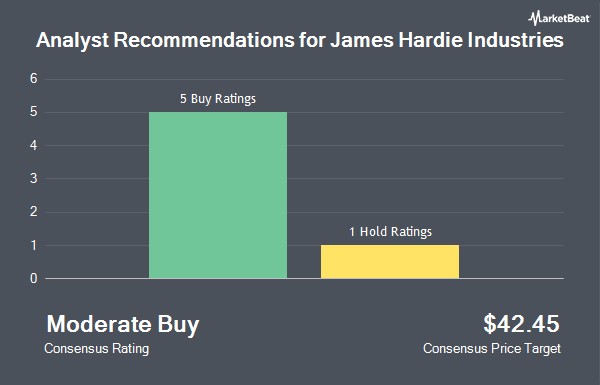 James Hardie Industries plc (NYSE:JHX - Get Free Report) has received a consensus recommendation of "Moderate Buy" from the six brokerages that are presently covering the stock, MarketBeat Ratings reports. One research analyst has rated the stock with a hold rating and five have given a buy rating to the company. The average 1 year price objective among brokerages that have issued a report on the stock in the last year is $39.12.