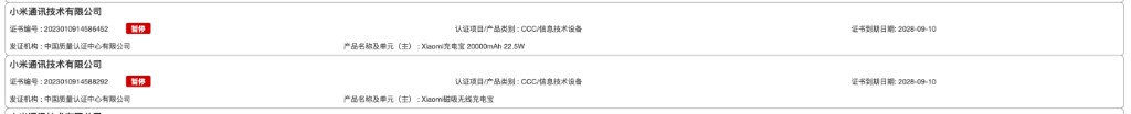 据国家市场监督总局,小米的 “Xiaomi 充电宝 20000mAh 22.5W”、“Xiaomi 磁吸无线充电宝” 被暂停 3C 认证;绿联科技的 “20000mAh 自带线快充移动电源” 3C 认证资格同样遭到暂停,距离其初次获证日期仅为 1 年左右。