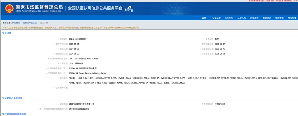 除此之外,近期小米、绿联科技的部分充电宝 3C 认证资格亦处于暂停状态。