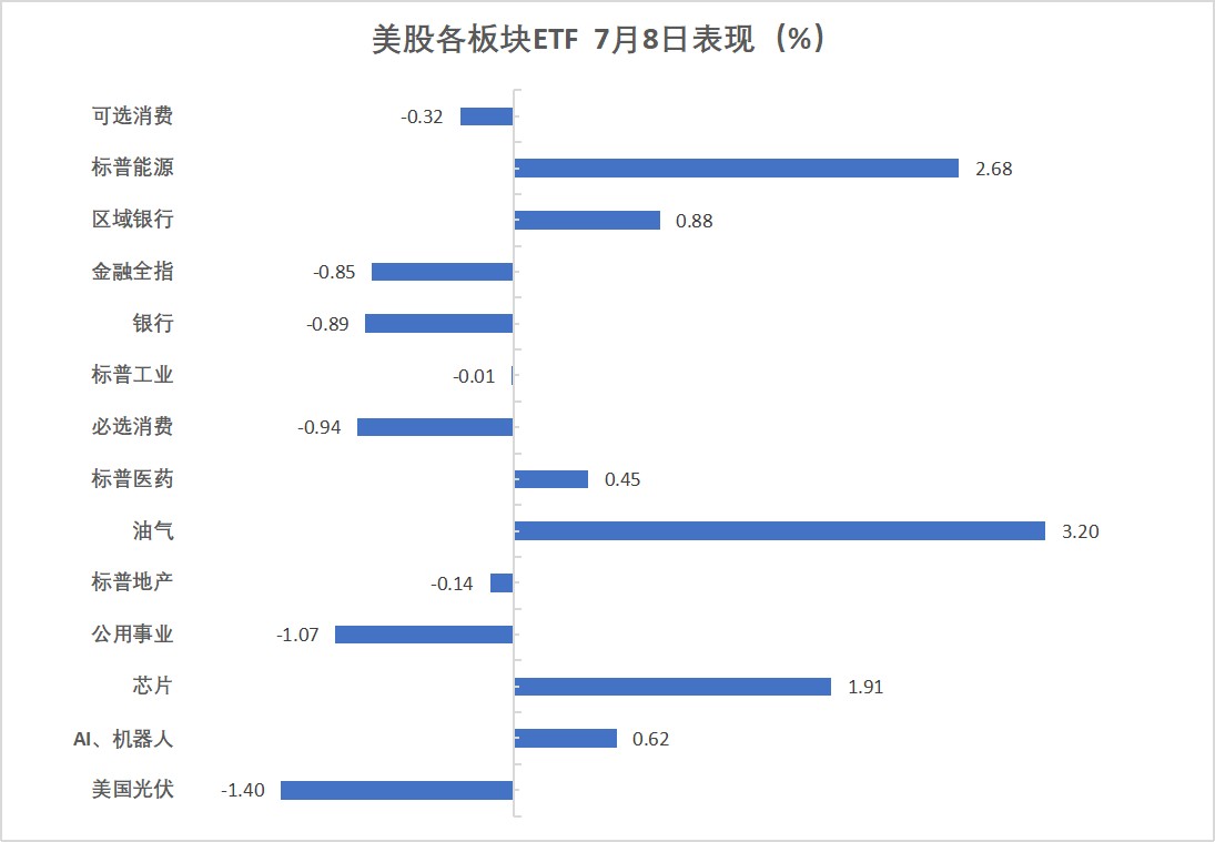 能源業 ETF 收漲 2.69%,半導體 ETF 漲 1.33%,可選消費 ETF 則收跌 0.34%,網絡股指數 ETF 跌 0.77%,金融業 ETF 跌 0.89%。