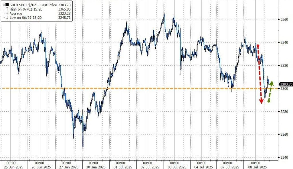 特朗普稱將實施 50% 銅關税,紐銅較日低一度暴拉超 18%。黃金跌 1.1%,盤中一度跌破 3300 美元。