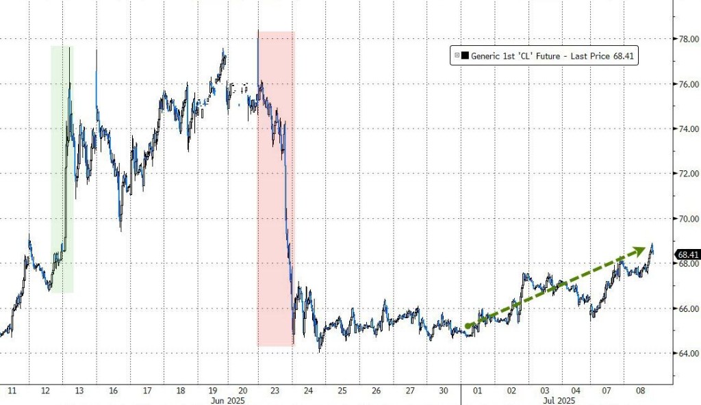 WTI 8 月原油期貨收漲 0.40 美元,漲幅將近 0.59%,報 68.33 美元/桶。