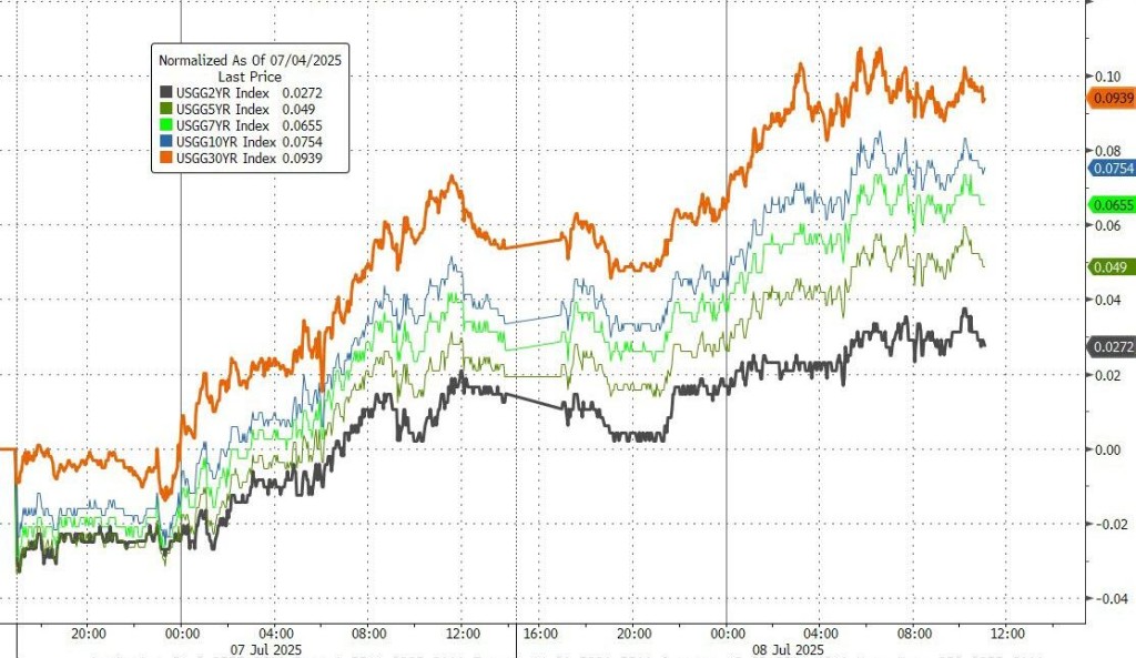 儘管特朗普將關税暫緩期延長至 8 月 1 日,但美國貿易政策不確定性仍在繼續,美股漲跌互現。英偉達收創新高、市值逼近 4 萬億美元。美債收益率延續昨日漲勢,20 年期美債收益率近 4 年來首次超過 30 年期。特朗普稱將實施 50% 銅關税,紐銅價格大漲突破 3 月 26 日高點。黃金盤中跌破 3300 美元關口後反彈。