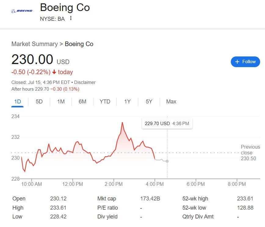 Boeing briefly turned positive during midday trading, reaching a daily high with an intraday increase of over 1.3%, but slightly turned negative towards the end of trading, closing down over 0.2%.