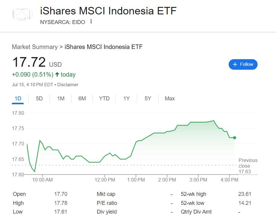 After Trump announced the agreement and the new tariff levels for Indonesia during the U.S. stock market's midday session, the Indonesia ETF, the VanEck MSCI Indonesia ETF (EIDO), saw its intraday gains expand to nearly 0.5%. The U.S. stock market's late session saw it refresh its daily high with gains exceeding 0.8%, ultimately closing up about 0.5%, rebounding after a decline on Monday, and no longer falling away from the closing high set on June 18.
