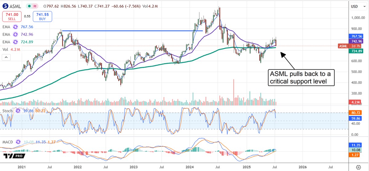 ASML 控股的股价在发布第二季度财报后,在盘前交易中下跌超过 8%,这可能创造了一个买入机会。尽管没有对 2026 财年的指引,但公司的基本面依然强劲,第二季度收入同比增长 23%。分析师维持中性买入评级,预计从发布前的价格来看有 12% 的上涨空间。然而,市场对空头头寸和潜在价格回调的担忧依然存在,特别是如果股价跌破 750 美元。建议投资者考虑其他顶级分析师推荐的股票