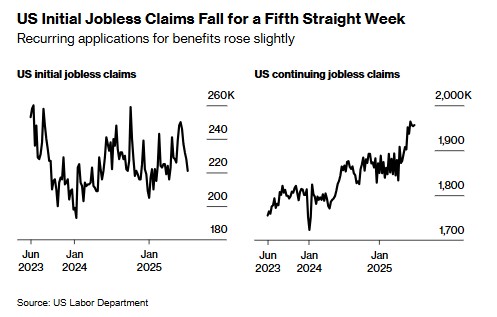 The job market shows signs of resilience as U.S. initial jobless claims decline for five consecutive weeks, hitting a three-month low