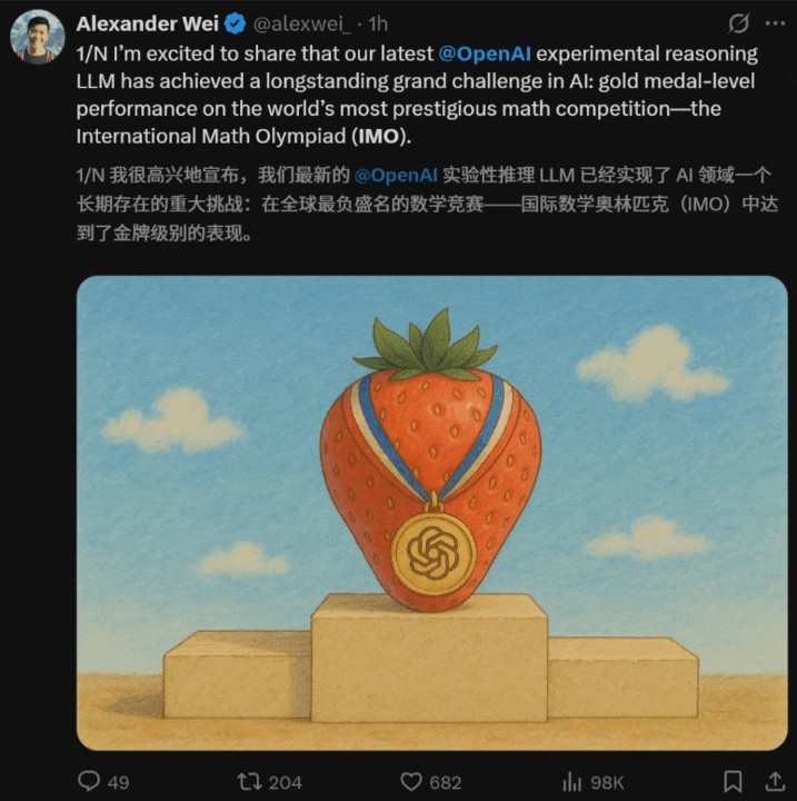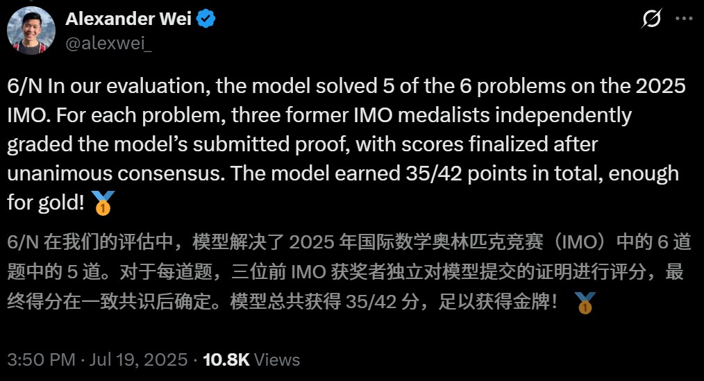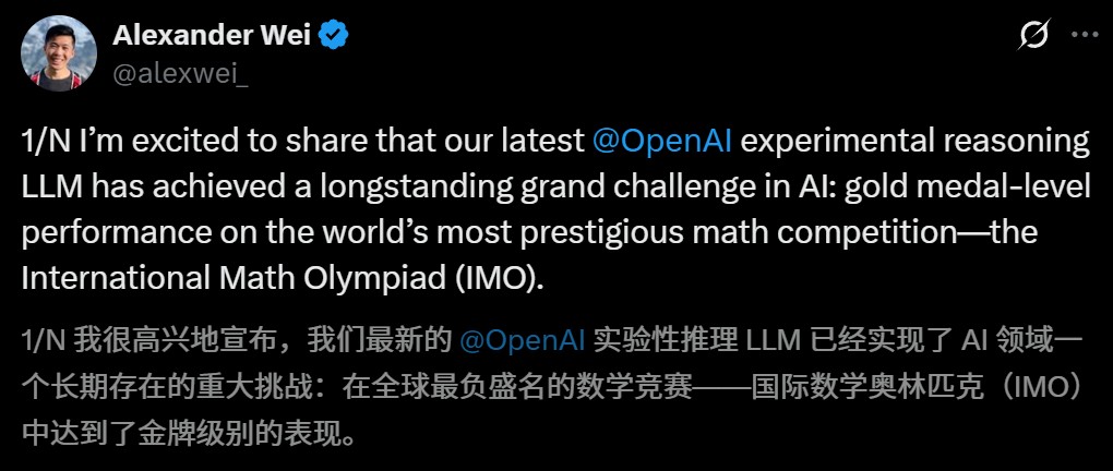 然而,就在剛剛,OpenAI 投下了一枚重磅炸彈——他們用一款全新的「通用推理模型」,成功奪下了 IMO 2025 的金牌!