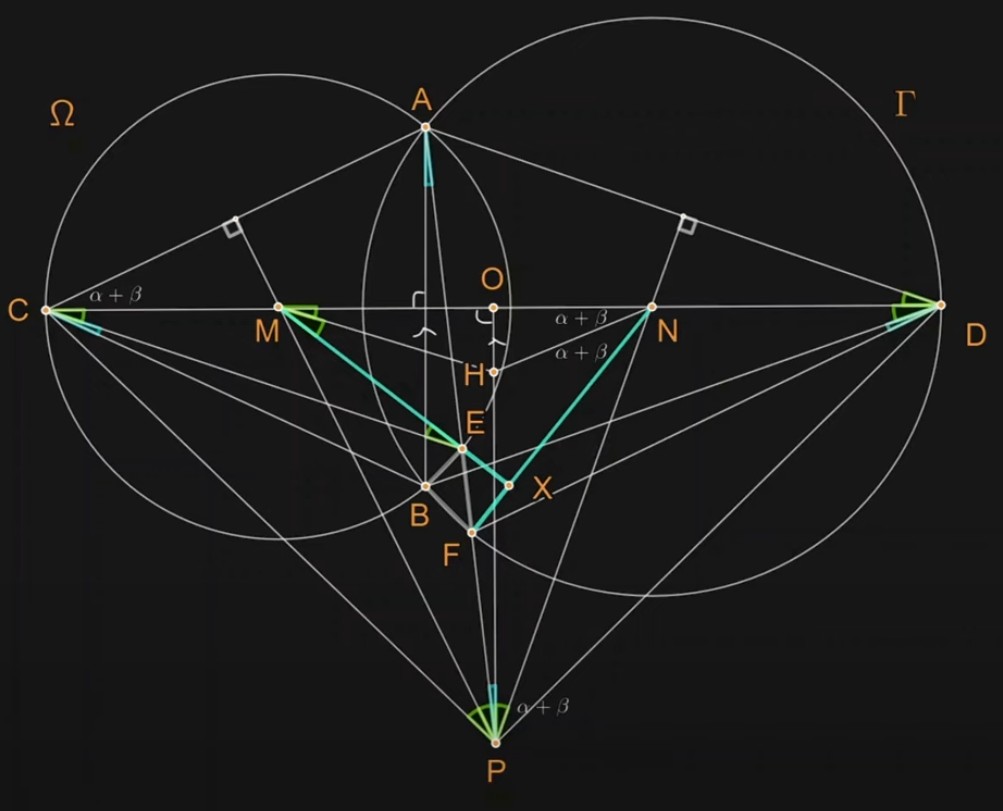 解析設定和參數。 設 P 為三角形 ACD 的外心。 連接 AP 與兩個圓Ω、Γ的交點分別為點 E、F。 求過點 B、E、F 的外接圓方程。