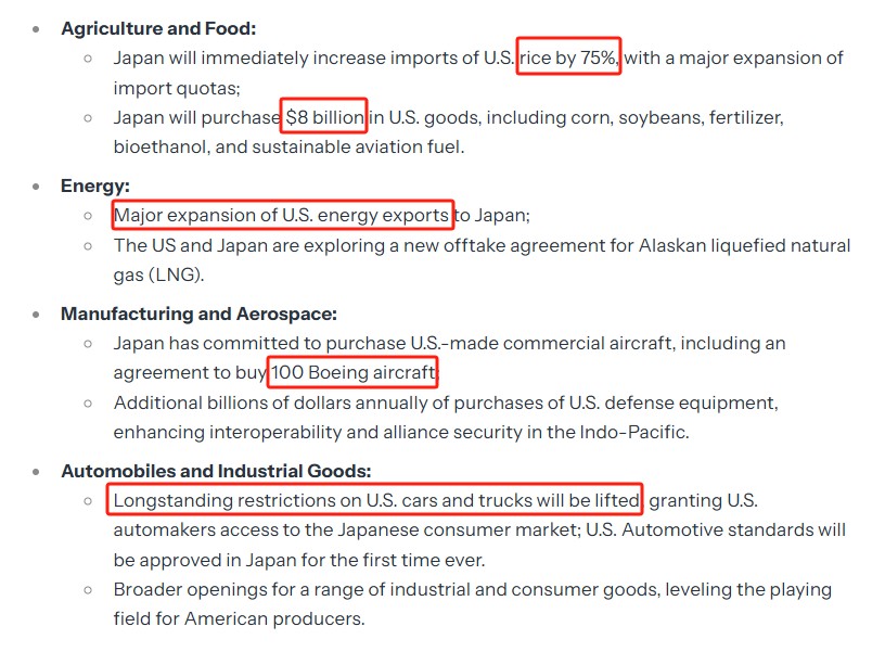 The agreement covers market access in key areas such as agriculture, energy, aerospace defense, and automobiles. In agriculture, Japan will immediately increase its import quota for US rice by 75% and purchase $8 billion worth of American agricultural products. In the aerospace sector, Japan has committed to purchasing 100 Boeing aircraft and other US-made civilian planes.