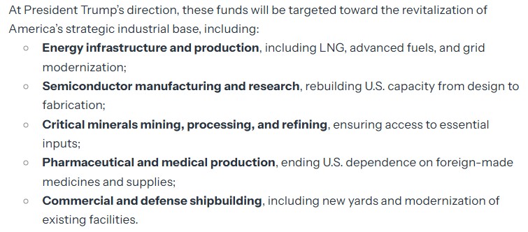 The agreement specifies that these funds will be directed towards the revival of America's strategic industrial base, including energy infrastructure and production, semiconductor manufacturing and R&D, critical mineral extraction and processing, pharmaceutical and medical product manufacturing, as well as commercial and defense shipbuilding.