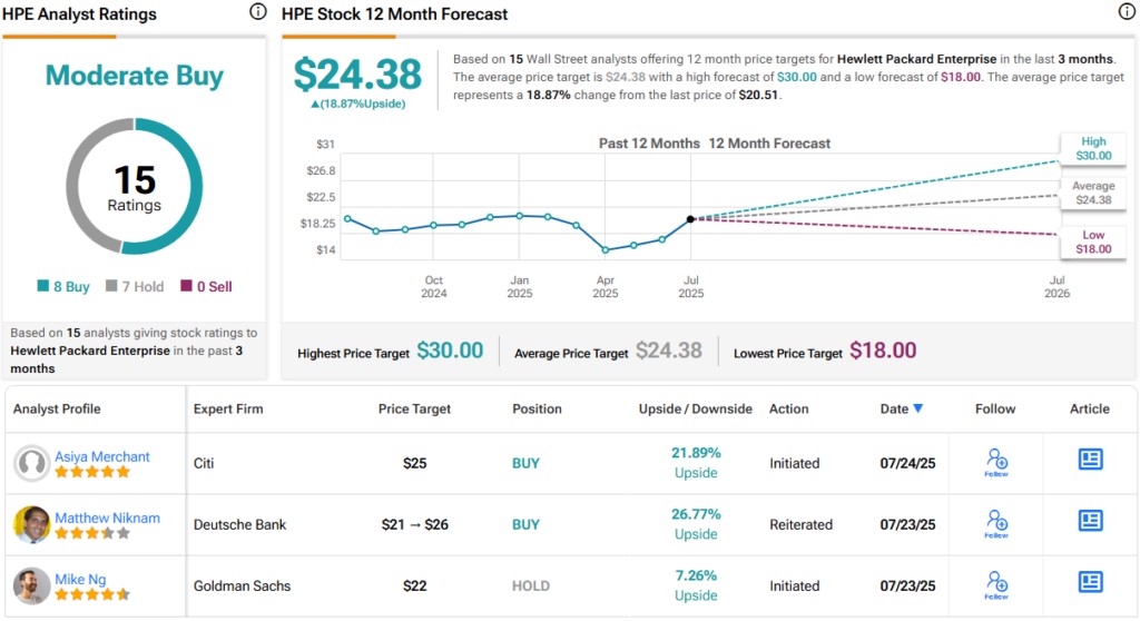 HPE shares have a Moderate Buy consensus rating, based on 15 recent analyst reviews with an almost even split of 8 Buys and 7 Holds. The stock is priced at $20.51 and its $24.38 average price target implies an upside of 19% in the next 12 months. (See HPE stock forecast)