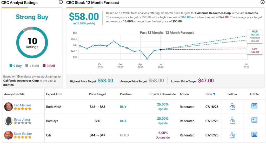 California Resources has earned a Strong Buy consensus rating from the Street’s analysts, based on 10 reviews that feature a lopsided split of 9 Buys and 1 Hold. The stock is currently selling for $50, and its $58 average price target suggests that the shares have an upside of 16% on the one-year horizon. (See CRC stock forecast)